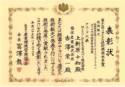 産業環境管理協会 第17回リサイクル本多賞「リサイクル技術開発本多賞」は、長年、廃棄物リサイクルの分野に携わってこられた元・大阪市立大学工学部教授、元(財)クリーン・ジャパン・センター参与 故本多淳裕先生が、自らの著書出版印税を3R関連開発に従事する研究者・技術者等へ提供し、研究及び技術開発を奨励する制度として提案なされ平成8年度に設立された表彰制度です。